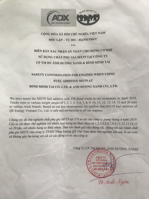 A test was performed in Vietnam with 378 diesel trucks running in and between the cities. Various truck weight ranges of 1, 2, 3, 4, 5, 6, 7, 8, 9, 10, 11, 12, 13, 14, 15 and 20 tons of various truck makes, the results confirmed that MXT9(R) fuel additive is safe and not harmful to any truck engines in the fleet.