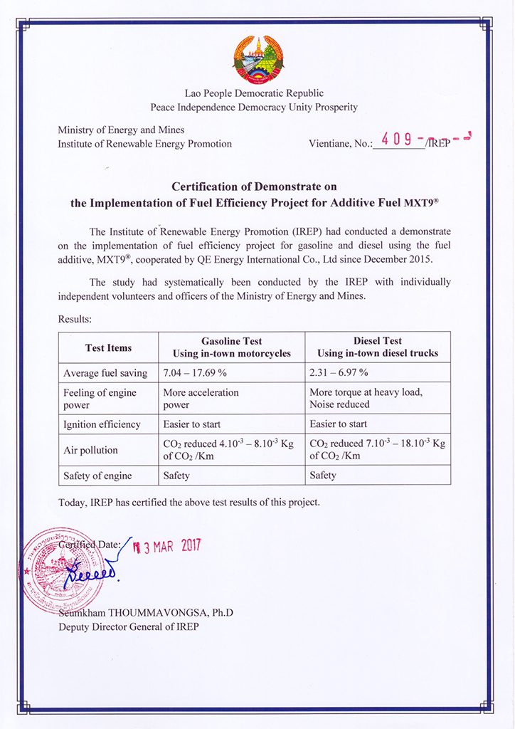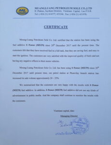 Lao Petroleum Station LMP has certified the quality of MXT9(R) fuel additive to use with both gasoline and diesel at the public petroleum station. More than 3,000 vehicles were filled in MXT9(R) fuel additive and the customers responded in a very positive improvement of engine power and savings. The test showed the higher fuel combustion efficiency which resulted in a higher sale record of the station by 10% – 12%.